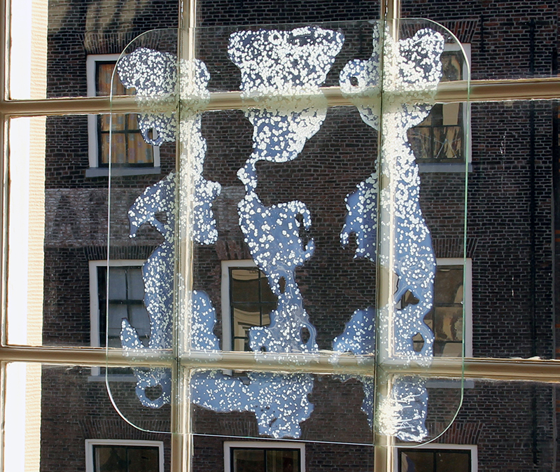In addition to these work on glass, Egied made performances with chemical reactions of solutions of materials like sugers, soda and salt in combination with heat, alcohol on top of overhead projectors. The projections showed landscapes in motion with running rivers and erupting volcanoes.