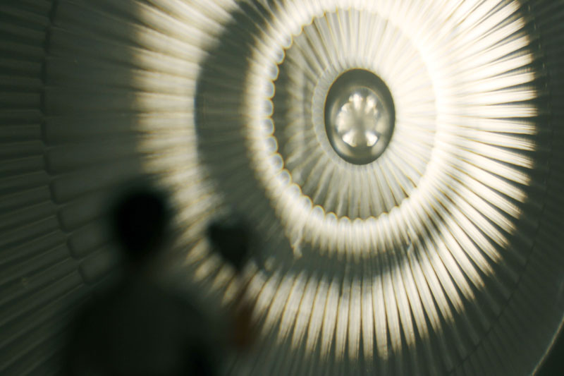 Reflecterende lamellen om de lamp vormen de iris van het oog.