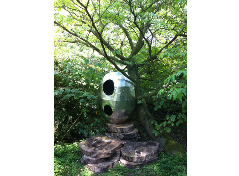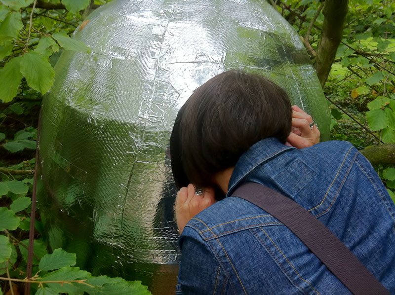 Onder de bijenboom (Evodia daniellii) is een zilverkleurig ei geplaatst met twee gaten. Door het bovenste gat kun je naar binnen kijken. Je ziet de bladeren en de takken van de boom geprojecteerd op een rond blad. Door het onderste gat kun je aan een hendel draaien. Hiermee draai je het blad naar boven of beneden en stel je scherp op een bepaald deel van de boom. Bijen komen af op de vruchten van de boom, je ziet ze vliegen tussen de bladeren.
