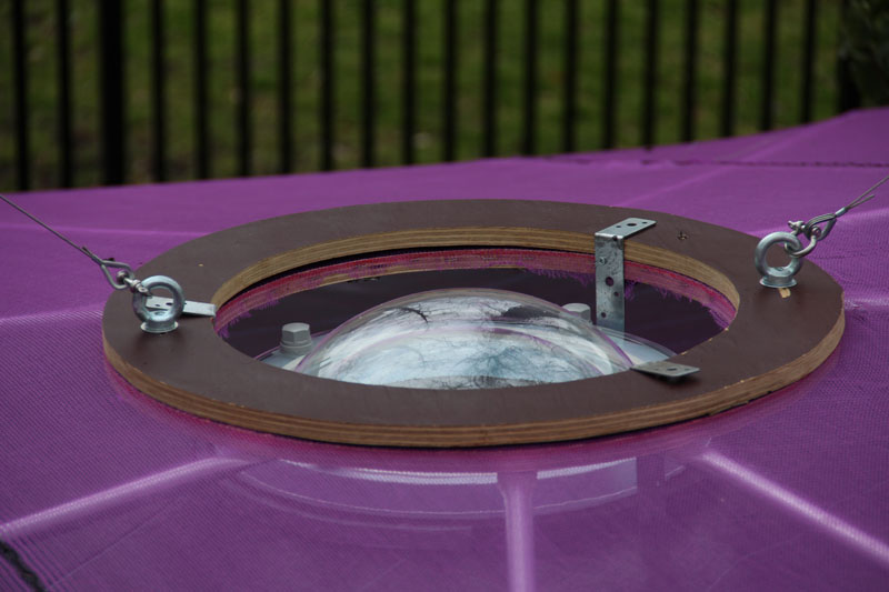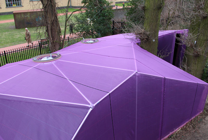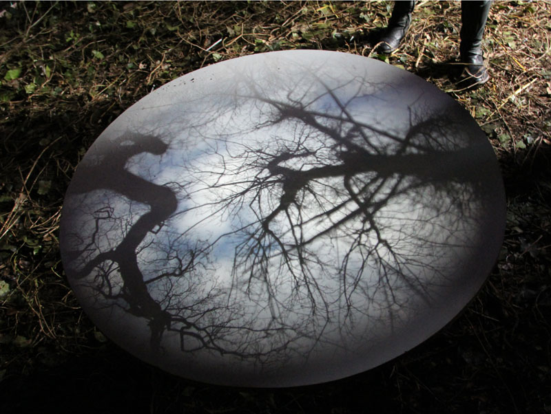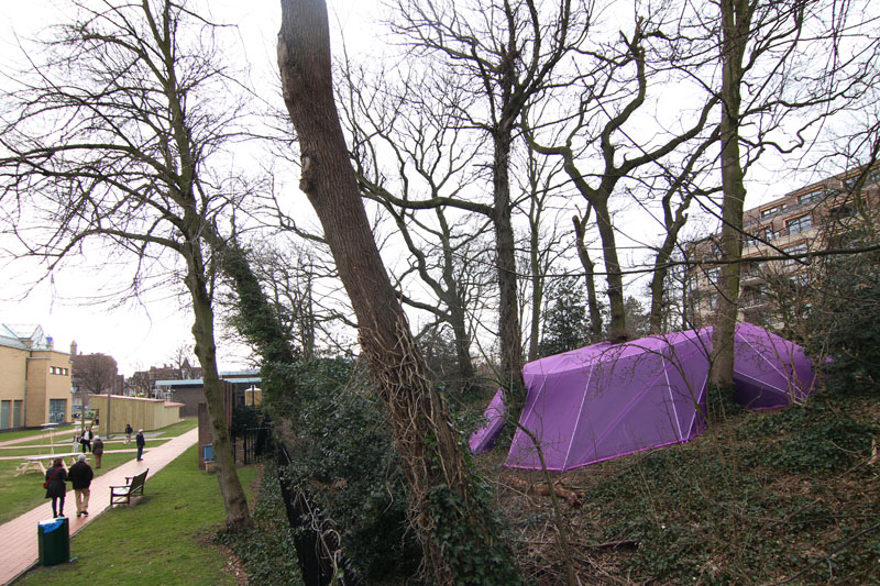 A camera obscura has been created in a polygon construction built among trees on the sand dune next to the museum. Two lenses are pointed straight up towards the crowns of the trees. Leaves and branches moving in the wind and passing clouds are being projected onto round tables. The trees are part of the artwork. The purple gauze on the outside will gradually become overgrown with climbing ivy. The depth of field can be adjusted by gently turning the table top.