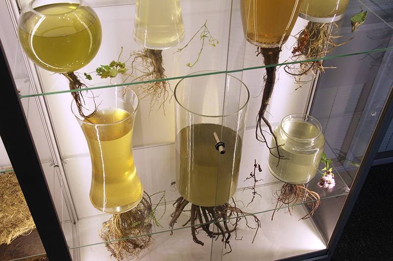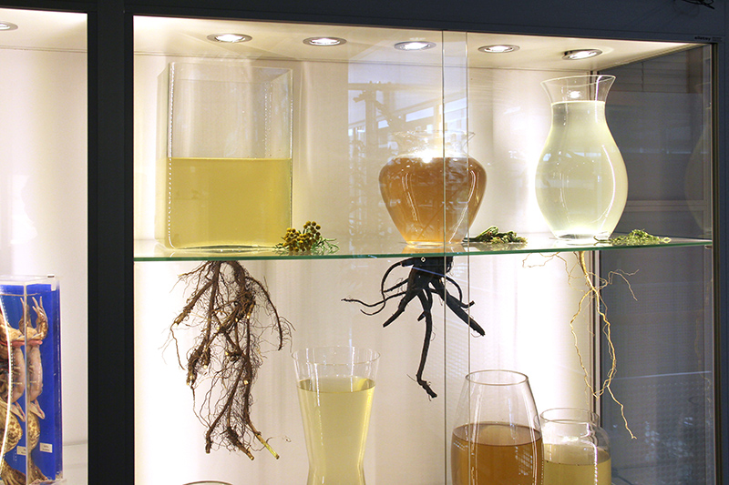 The vazes with the root extracts were placed on glass shelves, the roots were attached under the vazes.