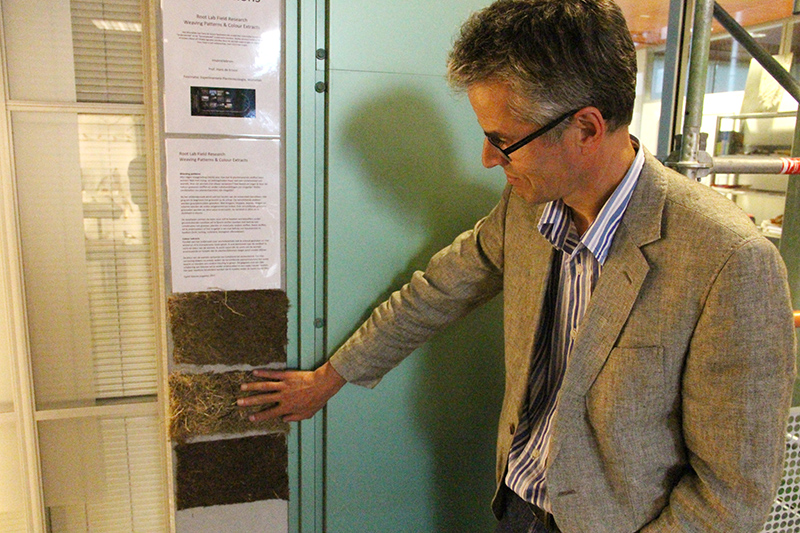How are plant roots interwoven? Not with warp and weft threads but with an assembly of roots. How can I harvest tissue from lawns and meadows? What type of treatment can I use to clean and preserve the weave? (cutting, washing, drying, shaving etc) What (combination of) plants (mostly grasses) produce the best rootweb? The next step would be to grow sophisticated rootfabrics himself. Egied used the garden plot of the university to harvest different tissues, he found a great variety in thickness, density and root types combinations.