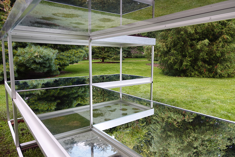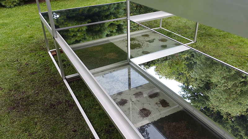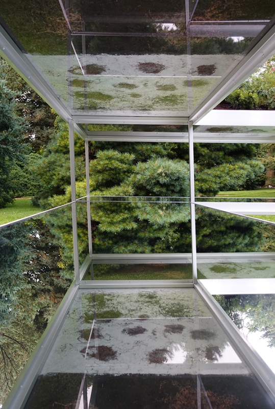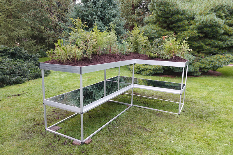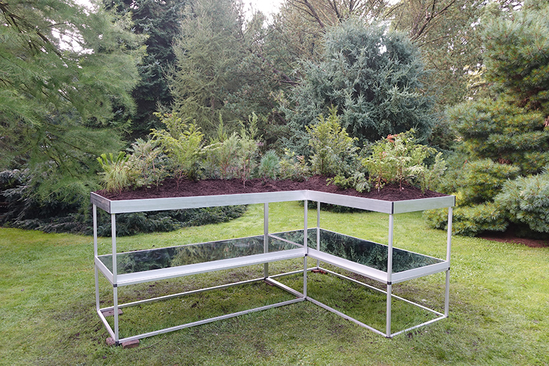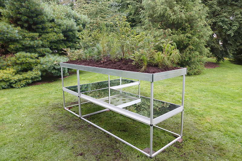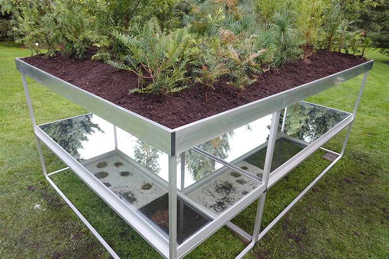Simons’ interest in plant life has extended to a study of root systems. How do roots of plants grasp and mingle with each other? Which strategy does the plant use in its search for a stronger grip as well as water? The underground texture reveals the traces of this search. In Pineteum Blijdenstein Simone presents the installation Radix Morgana Pinetum. On glass plates grow several conifers. The root growth can be followed through the use of mirrors.